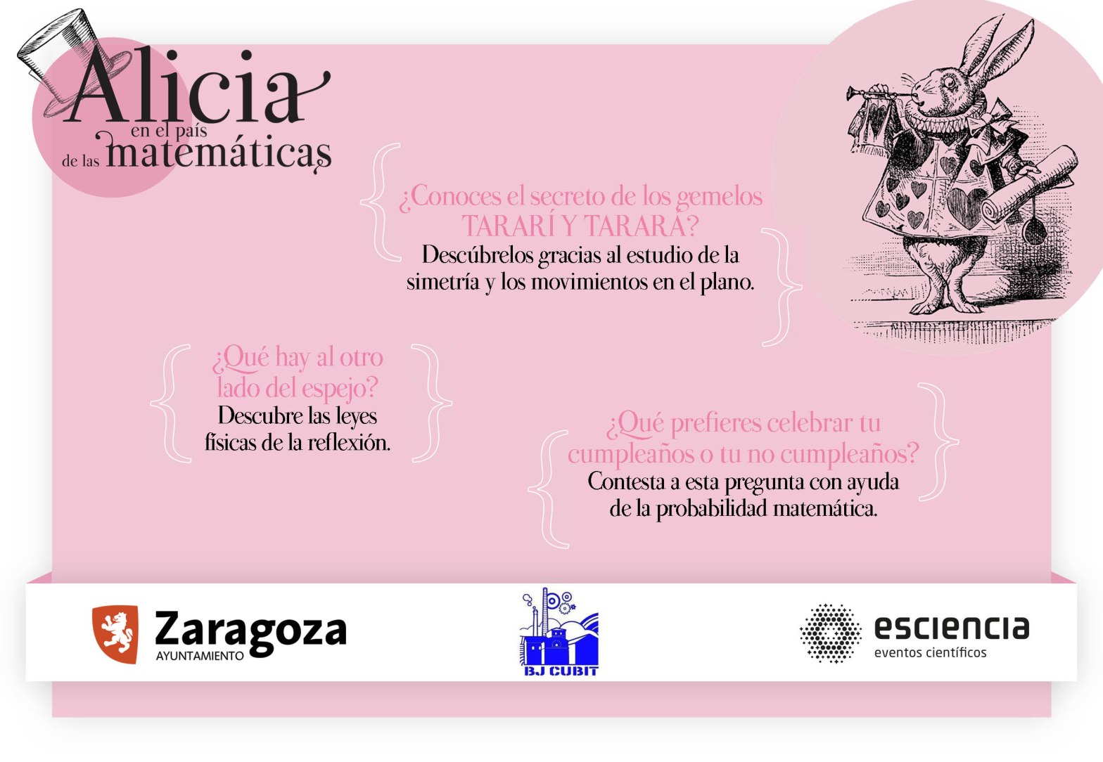 Desde el viernes 9 de febrero hasta el 14 de marzo se pone a disposición libre de todos los públicos la visita a la exposición Alicia en el País de las Matemáticas en el mismo horario en el que la Biblioteca permanece abierta. Asimismo, los grupos, centros educativos y público general que quisiera recibir un guiado de la exposición durante 75 minutos, pueden solicitarlo en el teléfono 976 875 237 por 65€ (IVA incluido).Este guiado lo realizarán varios alumnos y alumnas de distintos centros de Zaragoza los días 9 y 12 de febrero con motivo del Día de la Mujer y la Niña en la Ciencia.
