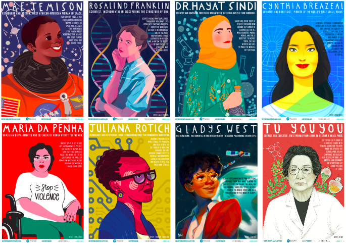 - Más de 60 iconos sobre mujeres científicas en distintos ámbitos y, en general, representando posiciones de liderazgo.