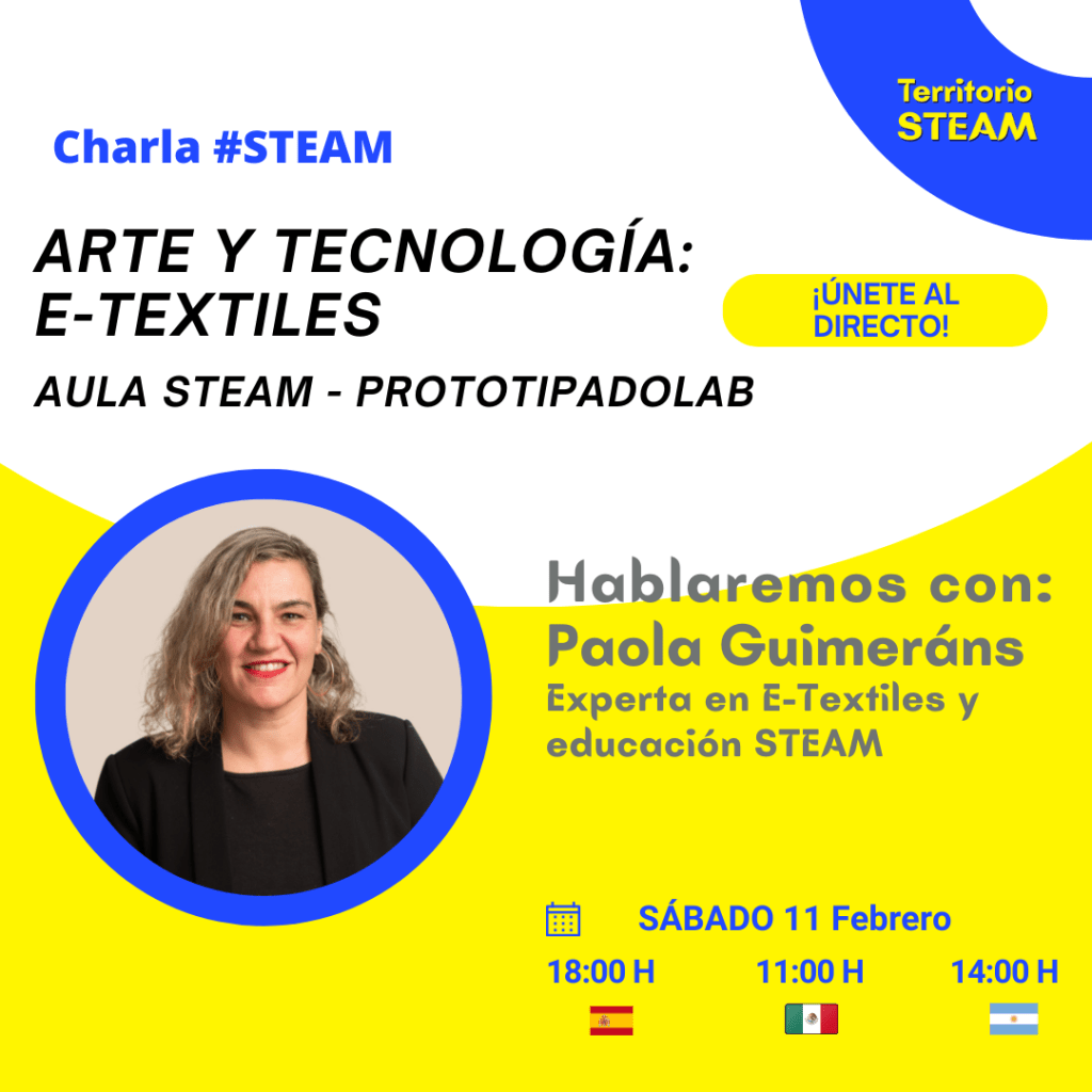 Charla STEAM con Paola Guimeráns, experta en e-textiles, diseño, educación. Hablaremos sobre arte, tecnología, creatividad, educación y el uso de los e-textiles para captar el interés de las chicas por las ciencias. Esta charla va dirigida al publico en general, familias, educadores, niños y el objetivo es acercar las STEAM a la sociedad. Paola Guimerans es Doctora por la Universidad Complutense de Madrid. Máster en Innovación Educativa por la Universidad Europea y MFA in Design and Technology por la Parsons School de Nueva York. Especialista en enseñanzas STEAM, y experta en Diseño de Interacción y Textiles Electrónicos aplicados a la Educación. Desde hace más de una década trabaja como asesora en innovación educativa. Es la autora de la plataforma de recursos tecnológicos “PrototipadoLAB” y la impulsora de la iniciativa educativa “Aula STEAM: E-textiles para apoyar la equidad y el aprendizaje STEAM” Ha impartido en el ámbito nacional e internacional numerosos talleres y conferencias.