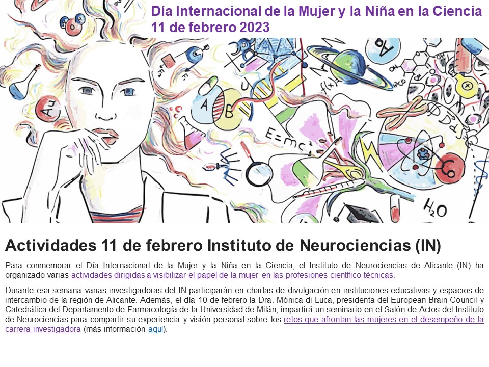 Para conmemorar el Día Internacional de la Mujer y la Niña en la Ciencia, el Instituto de Neurociencias de Alicante (IN) ha organizado varias actividades dirigidas a visibilizar el papel de la mujer en las profesiones científico-técnicas. Durante esa semana varias investigadoras del IN participarán en charlas de divulgación en instituciones educativas y espacios de intercambio de la región de Alicante. Además, el día 10 de febrero la Dra. Mónica di Luca, presidenta del European Brain Council y Catedrática del Departamento de Farmacología de la Universidad de Milán, impartirá un seminario en el Salón de Actos del Instituto de Neurociencias para compartir su experiencia y visión personal sobre los retos que afrontan las mujeres en el desempeño de la carrera investigadora (más información aquí).