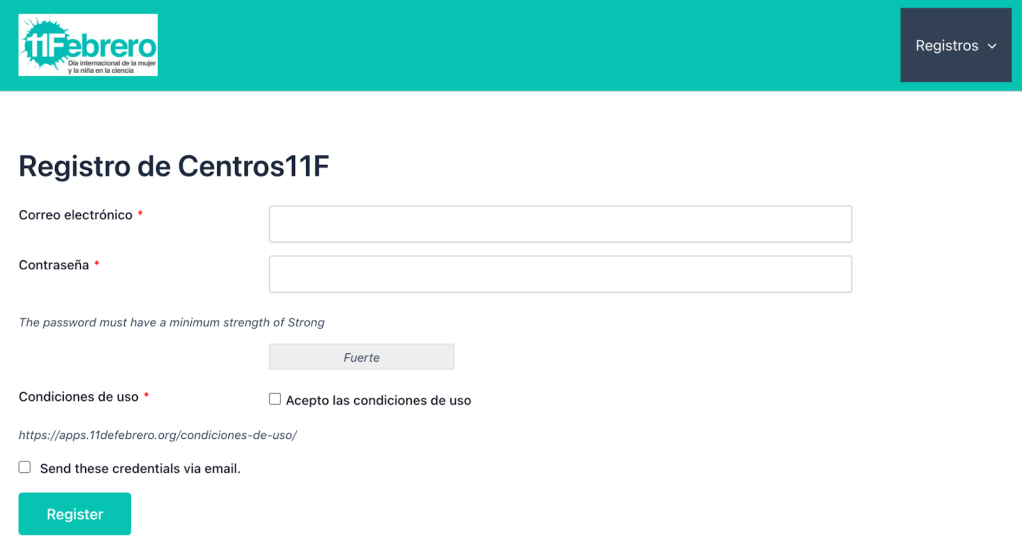 - Acceso al portal de registro en: https://apps.11defebrero.org/registro-de-centros/ y regístrate como «Centro11F».