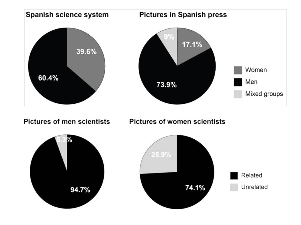 Arriba. Comparativa de la presencia de la mujer en el sistema científico español (izquierda) y su presencia en las fotografías en las noticias de ciencia en los medios de comunicación (derecha). Abajo: Protagonismo de hombres (izquierda) y mujeres (derecha) en las fotografías que aparecen en las noticias de ciencia. En color oscuro el porcentaje de fotografías en las que la persona que aparece es protagonista de la noticia y en color claro el porcentaje en el que la persona aparece como recurso fotográfico, sin que tenga una relación directa con la noticia. Fuente: González et al, Science Communication, 39, 4 (2017)