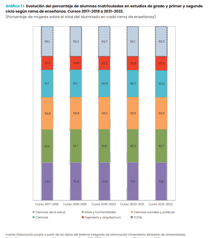 Según la última Encuesta de inserción laboral de titulados universitarios del INE, las tasas de actividad, empleo y paro por ramas de conocimiento desvelan mayores tasas de empleo entre quienes estudiaron Ingeniería en electrónica (98%), Desarrollo de software y de aplicaciones e Ingeniería multimedia (97,4%), e Ingeniería de telecomunicación (97,1%), puestos de trabajo de máxima cualificación y de acceso a la carrera científica que vienen condicionados por el perfil del alumnado desde la aproximación de género. El número total del alumnado matriculado en estudios de grado y primer y segundo ciclo en el curso 2021-2022 asciende a 1.338.304 personas del cual 56,3% son mujeres. Tal como muestra el siguiente gráfico extraído del Informe del Ministerio de Ciencia e Innovación, en los últimos 5 años este porcentaje se mantiene por encima del de hombres.