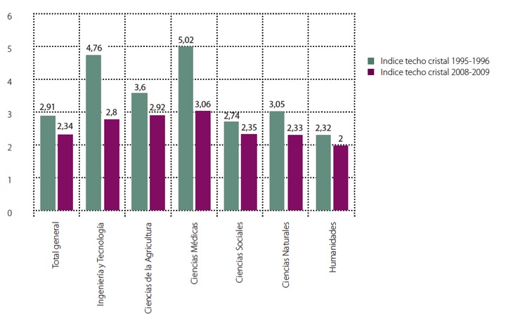 El Índice de techo de cristal capta las dificultades que las mujeres encuentran en su ascenso en la carrera investigadora, midiendo las oportunidades relativas de las mujeres, en comparación con las de los hombres, de alcanzar la posición más alta en la jerarquía investigadora. El Índice de techo de cristal compara la proporción de mujeres en la posición más alta (Cátedras) en relación a la de las mujeres en la investigación (Cátedras, Titularidad y demás categorías profesionales), indicando la posibilidad de que las mujeres puedan ascender en su profesión investigadora. El índice va de 0 a infinito. Un Índice de techo de cristal con valor 1 significa que no existen diferencias en la promoción entre mujeres y hombres. Un valor por debajo de 1 indicaría que las mujeres están sobrerrepresentadas en las Cátedras y un Índice de techo de cristal cuyo valor está por encima de 1 marca la existencia del techo de cristal, es decir, que las mujeres están infrarrepresentadas en las Cátedras. Cuanto mayor sea el valor del Índice, mayor es el techo de cristal y más difícil resulta para las mujeres alcanzar la posición más alta en la carrera investigadora.