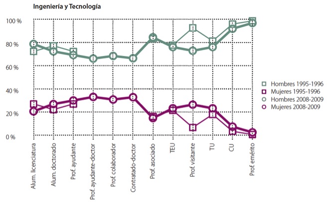 Proporción de hombres y mujeres en la carrera investigadora en Ingeniería y Tecnología. Comparación de los cursos 1995-1996 y 2008-2009. Fuente: Científicas en Cifras 2011.