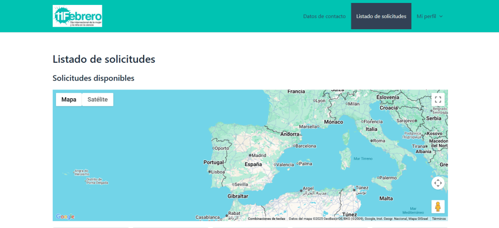 - Pestaña “Listado de solicitudes”: se verá un mapa con la localización de los centros educativos que solicitan charla. Elige la que más se ajuste a tu disponibilidad y temática, y propón tu charla.