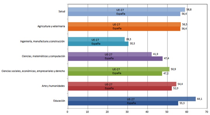 Porcentaje de mujeres con tesis leídas por rama de conocimiento. Datos de 2012 para España y la UE-27. Fuente: Científicas en cifras 2013.
